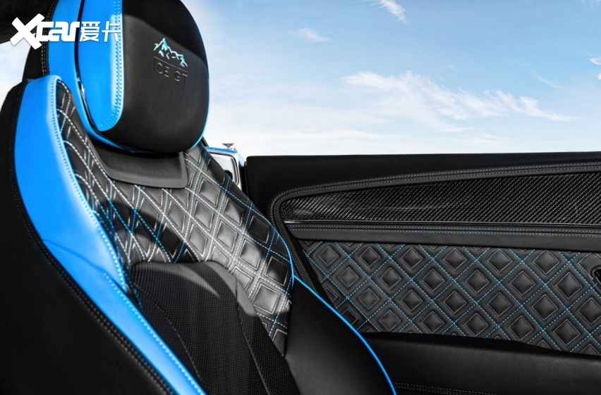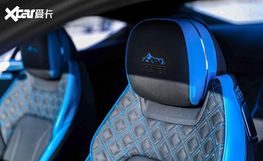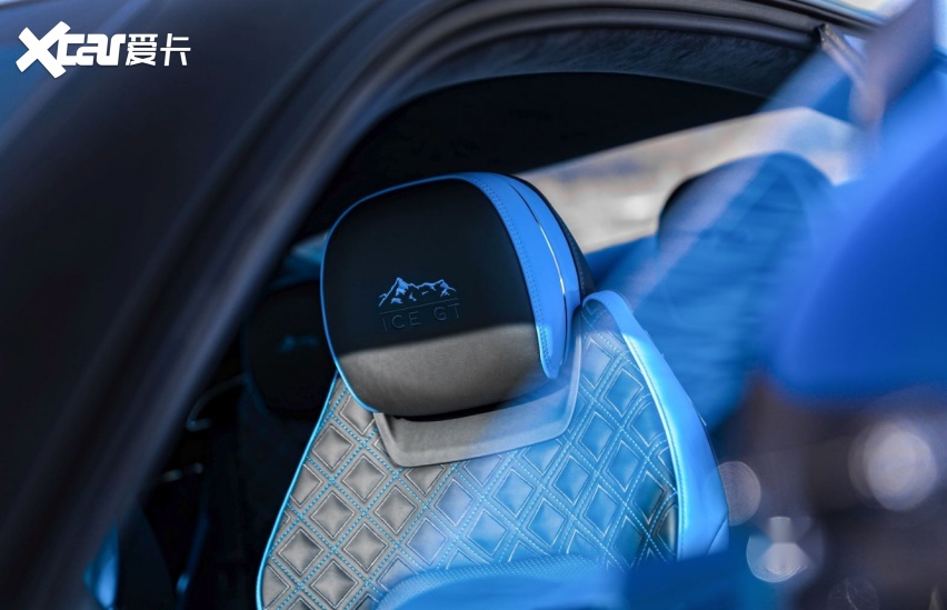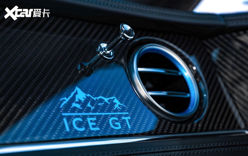 宾利品牌为Ice GT融入独特的Mulliner内饰配色方案。其中,座椅侧面皮革采用醒目的翠鸟蓝配色,与其同色的对比缝线则应用于座椅靠背、门板装饰和方向盘。座椅头枕处饰以Ice GT专属定制图案,其由“ICE GT”字样和雪山刺绣图案组成。车辆踏板与带有高亮设计效果的碳纤维内饰面板相呼应,均可见Ice GT专属定制图案。