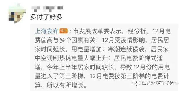 上海市发展改革委表示,经分析,12月电费偏高与多个因素相关:12月受疫情影响,居民居家时间延长,用电量增加;寒潮连续侵袭,居民家中空调制热耗电量大幅度上升;居民电费阶梯式递增,今年上半年居家时间比较久,导致12月份的用电量进入了第三阶梯,12月电费按第三阶梯的电费计算,所以有所增长。
