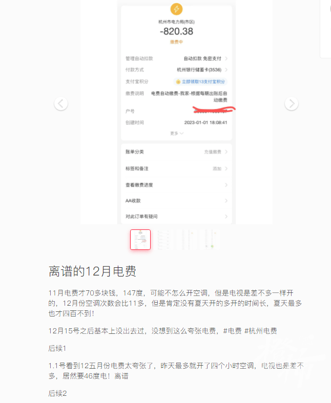 有上海、杭州网友晒出12月电费账单,并反映费用远超预期。也有网友晒出的账单显示,自家电费超过了1000元。