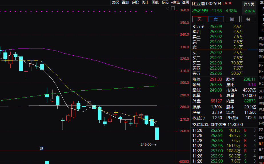 比亚迪A股大幅度下滑,盘中一度跌破250元重要关口位,日内跌幅一度逼近6%。