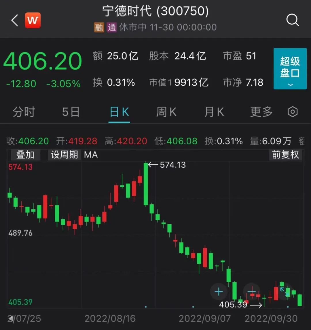 另一新能源赛道龙头股宁德时代盘中跌幅超过3%。截至午盘,宁德时代报406.2元/股,总市值9913亿元。