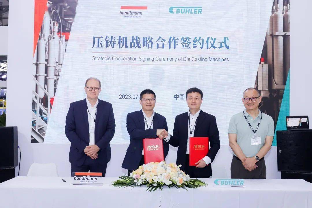 2023年7月13日下午,2023上海国际压铸展上,德国汉特曼(Handtmann)与布勒集团(Bühler)在布勒展位联合举行压铸机战略合作签约仪式。汉特曼金属铸造有限公司集团总部首席执行官Mr. Wolfgang Schmidt,汉特曼轻金属铸造(天津)有限公司总经理袁刚先生,布勒大中华区总裁王维波先生,布勒大中华区压铸事业部总监、布勒(中国)机械制造有限公司总经理卢敏先生等领导和嘉宾出席了本次签约仪式。