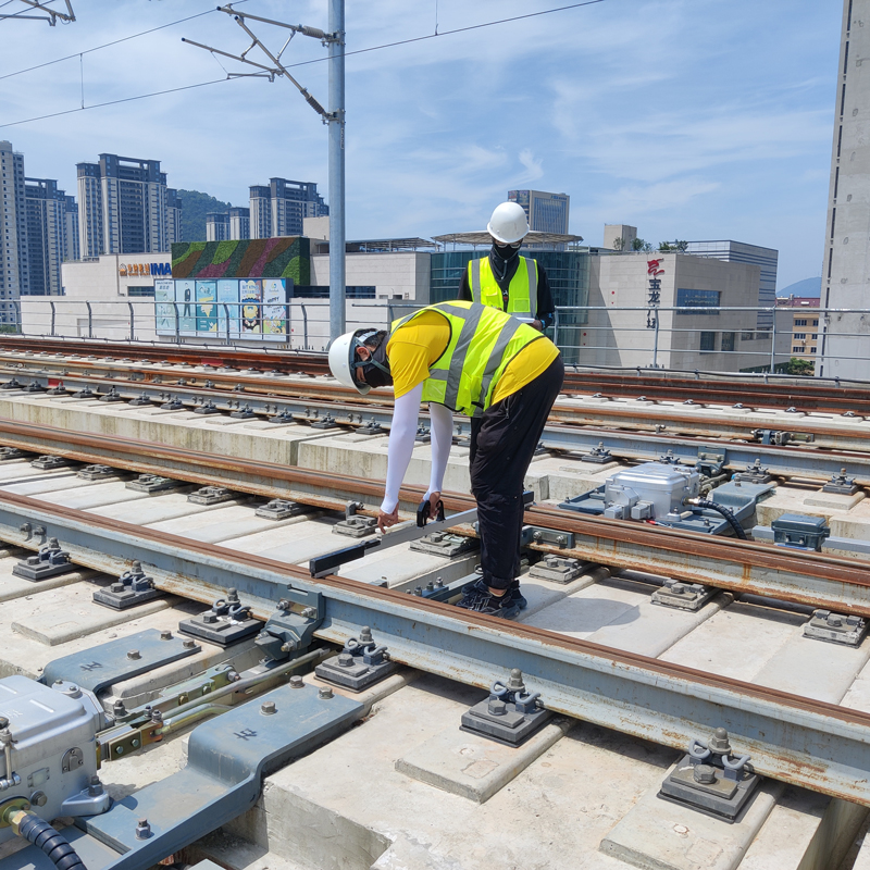室外的状况愈加“炎”酷。通过一上午太阳炙烤的轨迹钢轨,其温度早已打破50℃。工电中心轨迹专业的“轨迹医师”蒋宇狄、潘宇却在一步步丈量着滚烫的钢轨,为全线轨迹进行着“探伤”作业。这项“探伤”作业,“轨迹医师”们一周至少要进行4次,每一次都要在104余公里的轨行区走上一整天。即便穿戴了防晒配备,二人身上仍是留下了显着的晒痕。